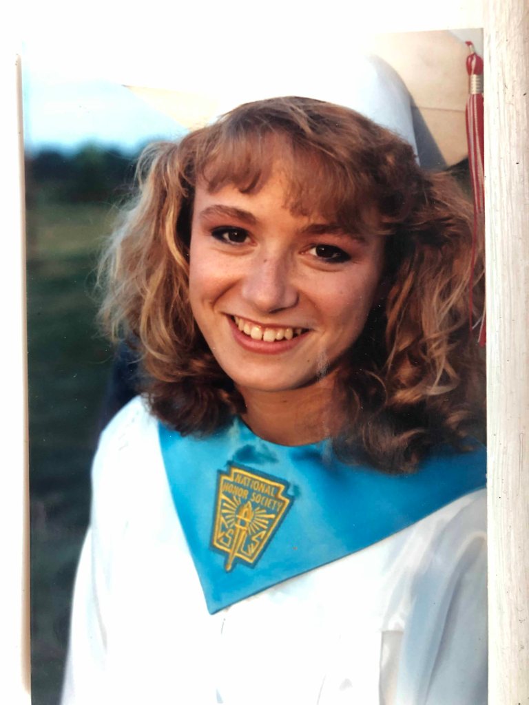 from 1989–my senior year in high school—from left to right: senior pic, prom (the guy is a family friend who drove our limo), & graduation